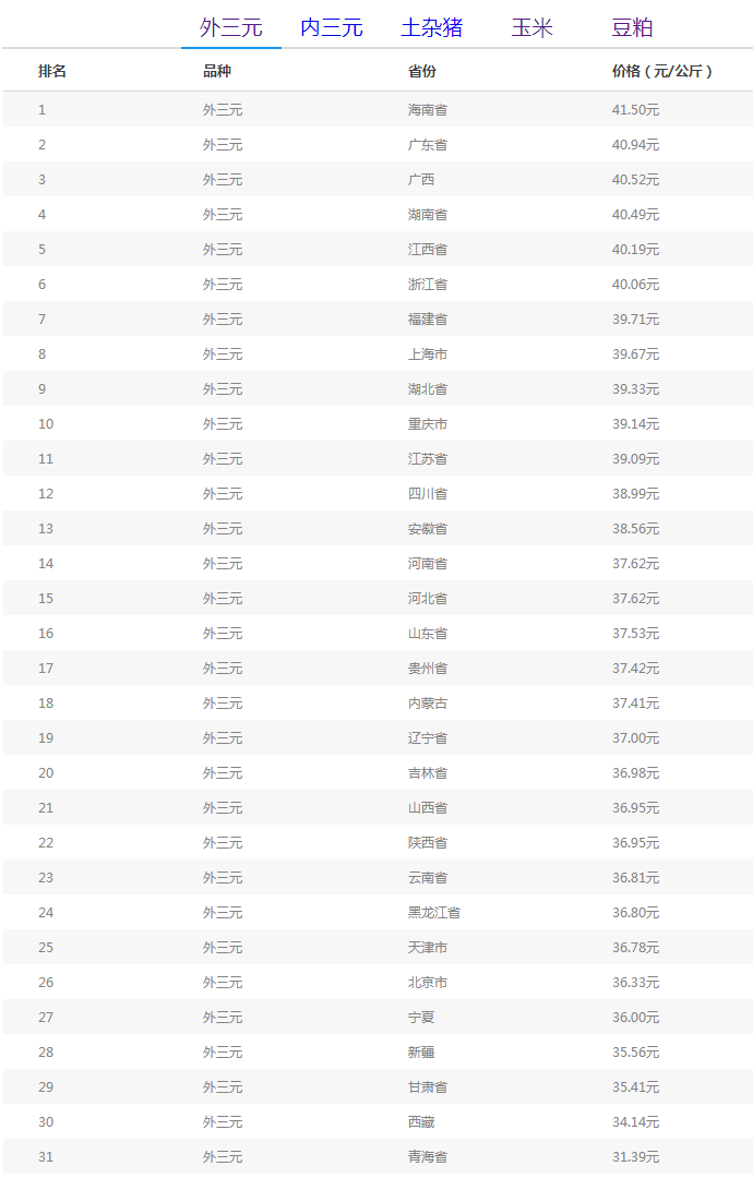 从“全国外三元均价排行榜”来看,在多省猪价下跌的情况下,海南省依然独树一帜的再涨0.50元/公斤,猪价为41.50元/公斤,把广东省、广西等省份甩在身后;但其他省份在今日依旧不甘示弱,目前猪价在40元/公斤的省份排名为海南省、广东省、广西壮族自治区、湖南省、江西省、浙江省。