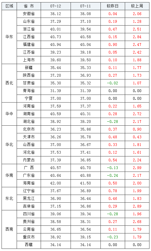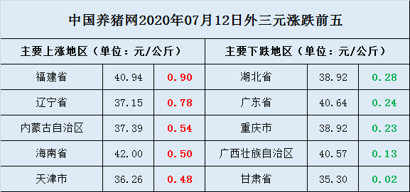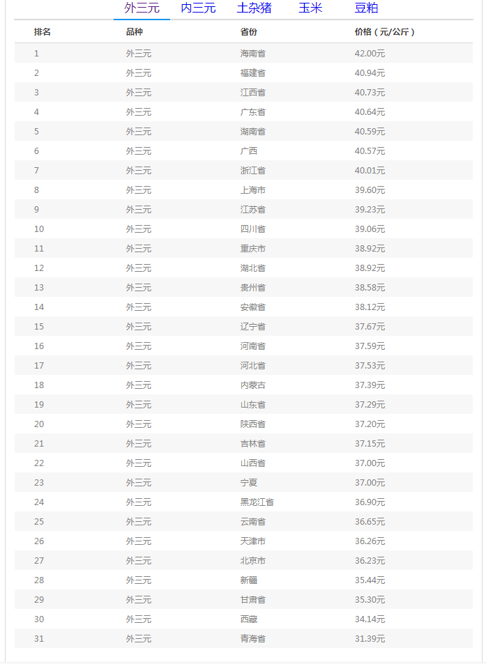 从“全国外三元均价排行榜”来看,突破40元/公斤的阵容没有太多变化,海南省42.00元/公斤、福建省40.94元/公斤、江西省40.73元/公斤、广东省40.64元/公斤、湖南省40.59元/公斤、广西壮族自治区40.57元/公斤、浙江省40.01元/公斤!