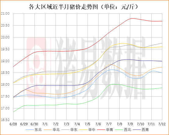 华东、华中、西北、华北地区猪价有着一定的上涨态势,东北、西南地区猪价有着一定的下跌现象,华南地区猪价呈现稳定态势,整体猪价微幅反弹。