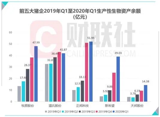 (前五大猪企2019年Q1至2020年Q1生产性生物资产余额 数据来源:各企业财务报告)