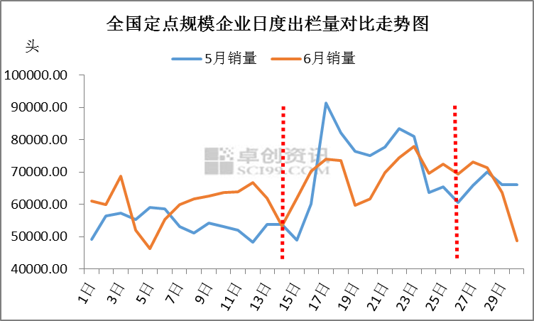 根据卓创对国内定点规模企业日度生猪出栏量的走势图进行分析,5-6月份规模场在1日-13日生猪出栏量偏少,总出栏量占全月计划量的35%-48%。15日-30日,生猪出栏量占全月的52%-65%。加上5月中旬后期,猪价的深度探底导致部分大猪集中出栏,同时6月社会猪源偏少支撑养殖场出栏计划提前完成,7月部分场生猪出栏均重降至135.00公斤以下,为提升头均盈利而压栏惜售。7月上旬,养殖场压栏情绪较重,且养殖户对大猪市场看涨,标猪出栏积极性较差,7月下旬,猪源整体较中上旬或偏多,但整体增加幅度或有限。