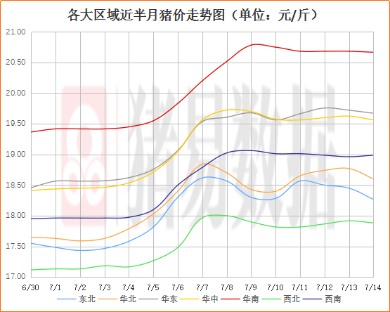 西南地区猪价有着一定的上涨态势,东北、华北、华东、华中、华南、西北地区猪价有着一定的下跌现象,整体猪价小幅微跌。