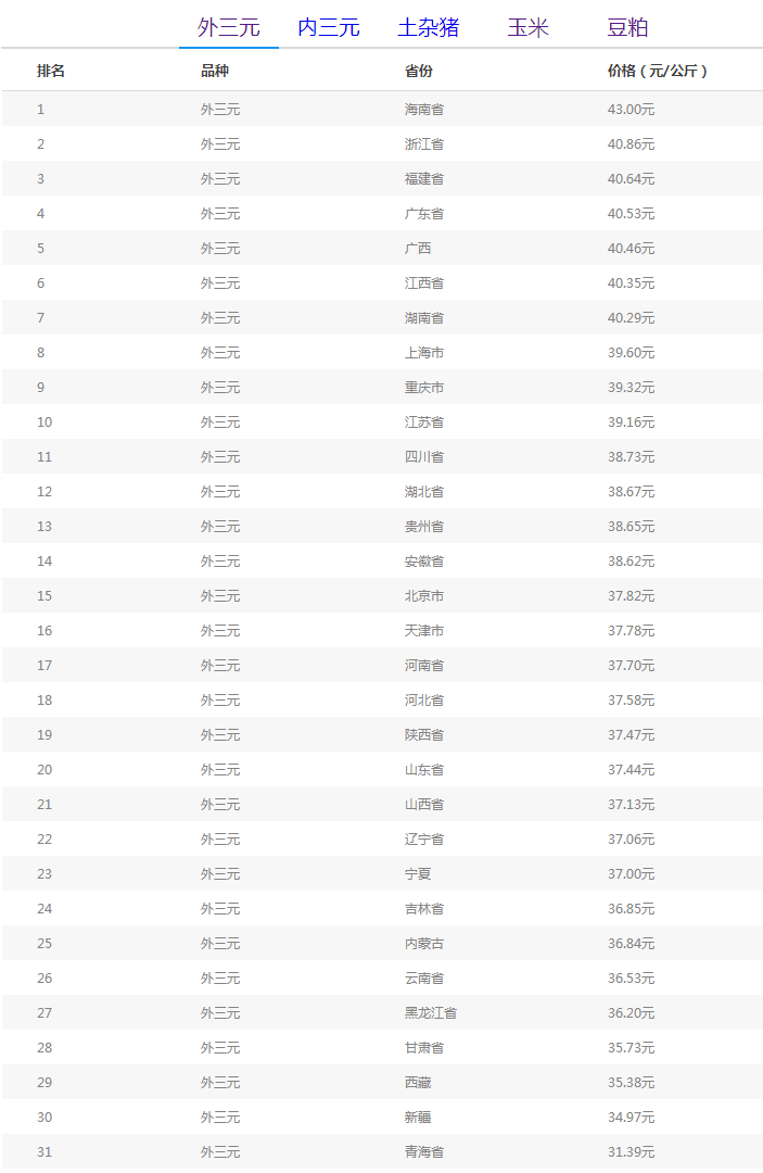 从“全国外三元生猪均价排行榜”来看,今日海南省生猪均价再涨0.50元/公斤,该地猪价一度已达43.00元/公斤再次突破之前的记录创近期新高。紧随其后的是超越福建省的浙江省上位,但浙江省猪价并未高涨,仅仅只是福建省今日有下跌情况。综合来看,在40元/公斤的猪价依旧是7个,变化不大。