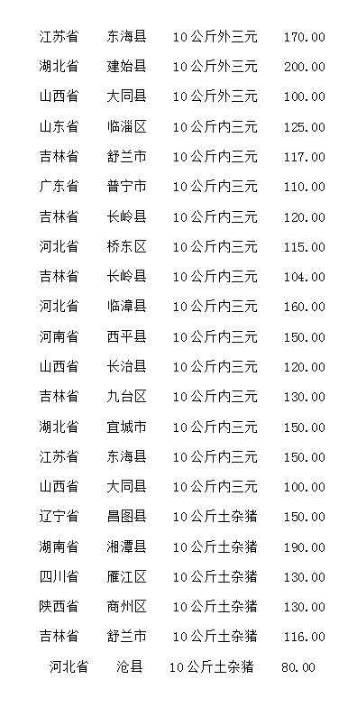活猪价格排名后五的地区:青海省、新疆维吾尔自治区、西藏自治区、甘肃省、黑龙江省。