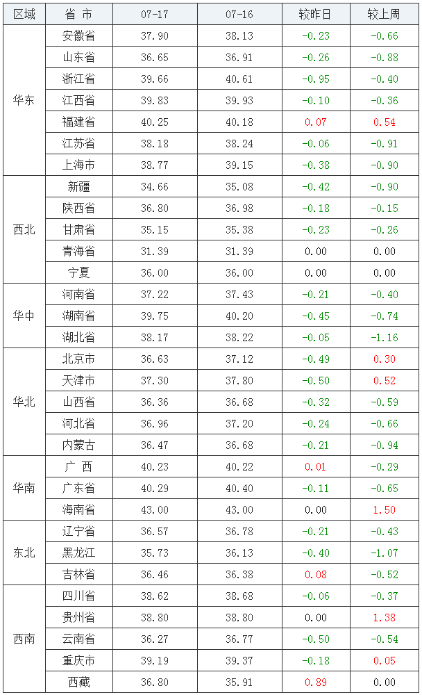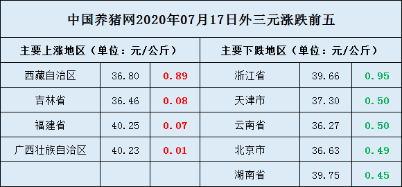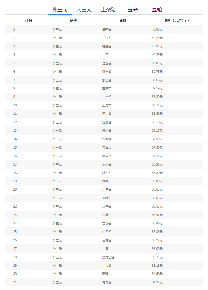 从“全国外三元生猪均价排行榜”来看,今日我国处于高位水平的省份猪价正在稳步下滑,今日我国“40元”队伍再次裁员,目前只剩下4省。猪价最高位的海南省价格水平看似没有变动,但因其独特的地理优势,信息更新有一定的延迟,在现在全国普遍下跌的行情下,海南省猪价有很大的可能在下滑!
