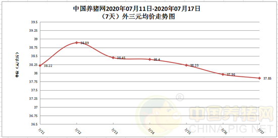 从“中国养猪网2020年07月11日-07月17日(7天)外三元均价走势图”来看,国内生猪均价走势继续下滑,但可以好在跌势不大,