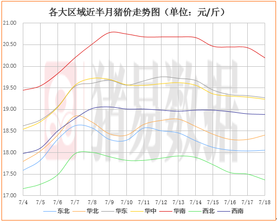 西南、华东、华中、华南、西北地区猪价有着一定的下跌现象,东北、华北地区猪价呈现微涨态势,整体猪价继续微幅下调