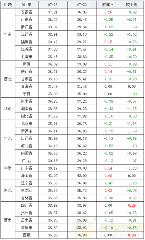 华东地区上涨省份幅度在0.15-0.26元/公斤,下跌省份幅度在0.14-0.52元/公斤;