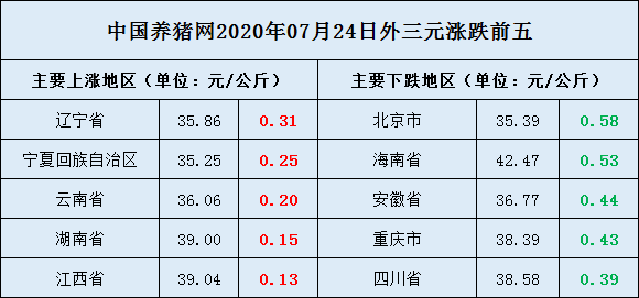 今日猪价下跌最高地区为:北京市,外三元均价为35.39元/公斤,较昨日下跌了0.58元/公斤。