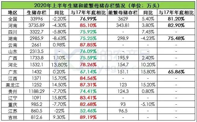 自2018年非洲猪瘟肆虐以来,全国各地生猪产能出现不同程度下降,经过一系列复养扩栏政策及措施的实施。2020年6月末全国能繁母猪存栏3629万头,同比首次由负转正,比去年底增加549万头,已恢复到2017年年末的81.2%;生猪存栏接近去年同期水平,达到3.4亿头,比去年底增加2929万头,存栏量相当于2017年年末的77%。