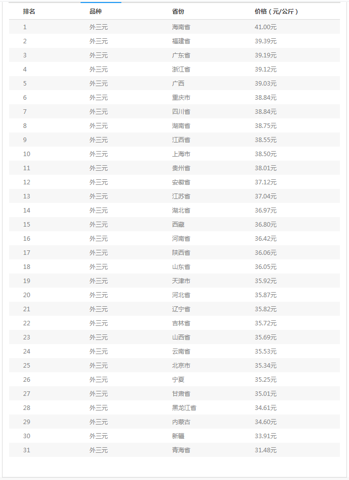 从“全国外三元生猪均价排行榜”来看:今日我国生猪价格排名前五的省份分别是海南省、福建省、广东省、浙江省以及广西壮族自治区;今日生猪价格排名后五的省份分别是青海省、新疆维吾尔自治区、内蒙古自治区、黑龙江省以及甘肃省。