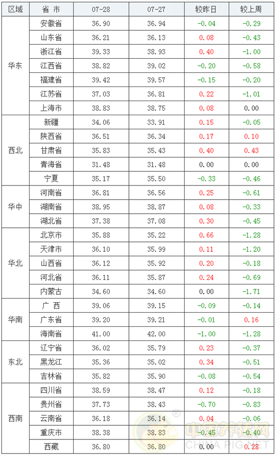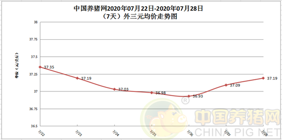 2020年07月28日(星期二),据中国养猪网猪价系统监测全国外三元均价为37.19元/公斤,猪价较昨日(37.09元/公斤)上涨了0.10元/公斤,较上月上涨2.19元/公斤。