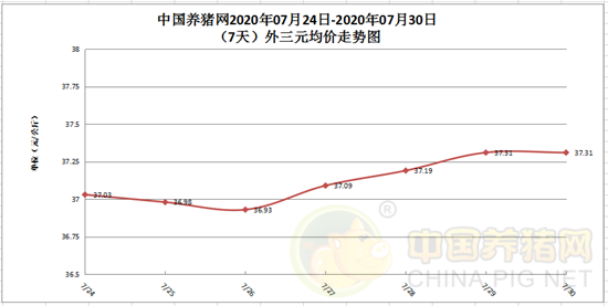 2020年07月30日(星期四),据中国养猪网猪价系统监测全国外三元均价为37.31元/公斤,猪价较昨日(37.31元/公斤)持平,较上月上涨1.41元/公斤。