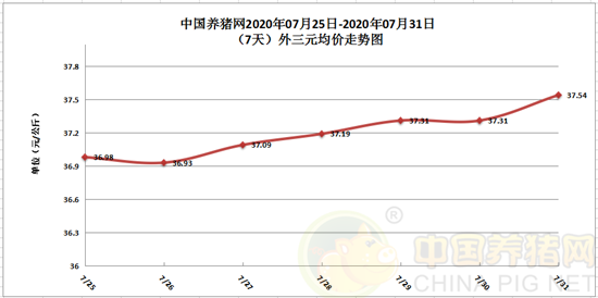 2020年07月31日(星期五),据中国养猪网猪价系统监测全国外三元均价为37.54元/公斤,猪价较昨日(37.31元/公斤)上涨0.23元/公斤,较上月上涨1.45元/公斤。