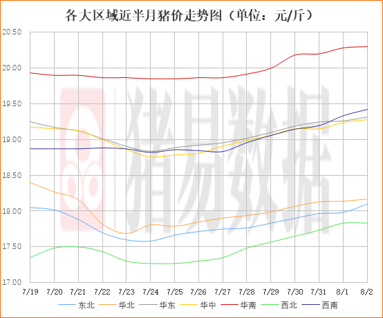 东北、华北、华东、华南、华中、西南地区猪价有着一定的上涨现象,西北地区猪价呈现稳定,整体猪价继续微涨。