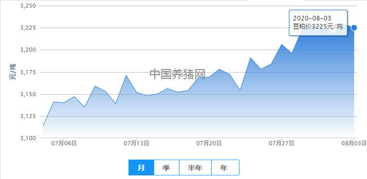 2020年08月03日(星期一),今日全国豆粕均价为3225元/吨,报价与昨日下跌4元/吨,报价与上周上涨了19元/吨,较上月上涨了111元/吨!