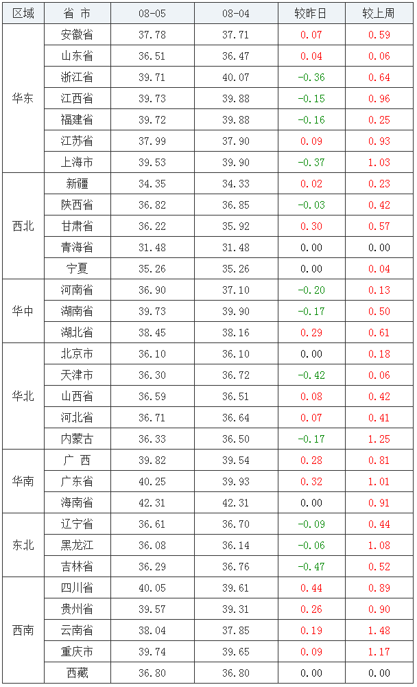 从上表来看,上涨省份较昨日再减少2个;持平省份再增加1个;下跌省份再增加8个。整体来看,今日涨势主要集中在华南及西南一带。虽其他地区也有上涨走势,但涨势仅在少部分省份有“小动作”。