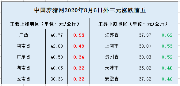外三元排行前五地区:海南省42.80元/公斤、广西省40.77元/公斤、广东省40.59元/公斤、湖南省40.05元/公斤、四川省39.98元/公斤。