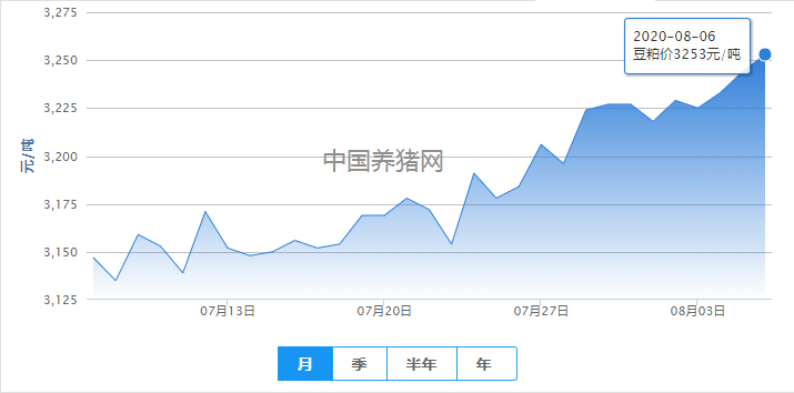2020年08月06日(星期四),今日全国豆粕均价为3253元/吨,报价与昨日上涨9元/吨,报价与上周上涨了26元/吨,较上月上涨了106元/吨!