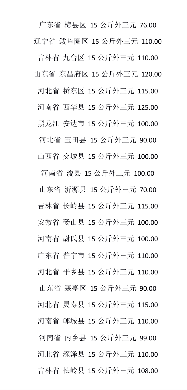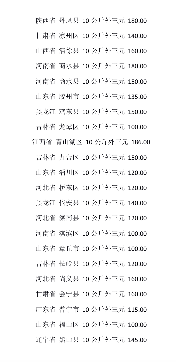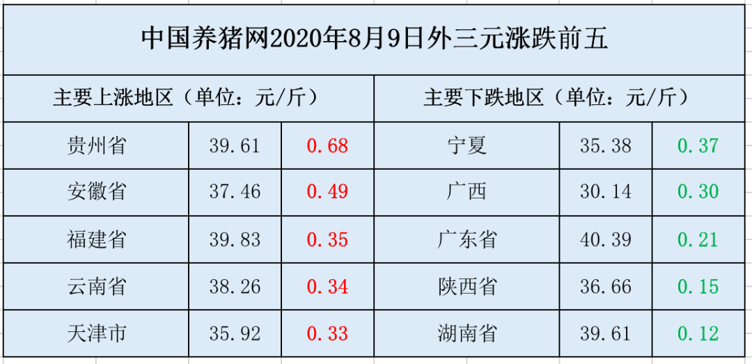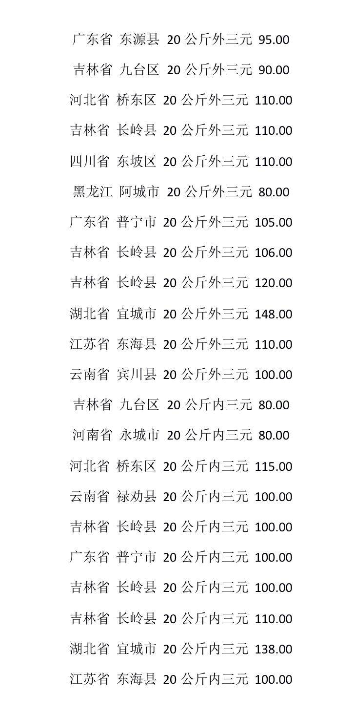 内三元排行前五地区:海南省41.52元/公斤、贵州省39.75元/公斤、广东省39.43元/公斤、湖南省39.37元/公斤、四川省39.27元/公斤。