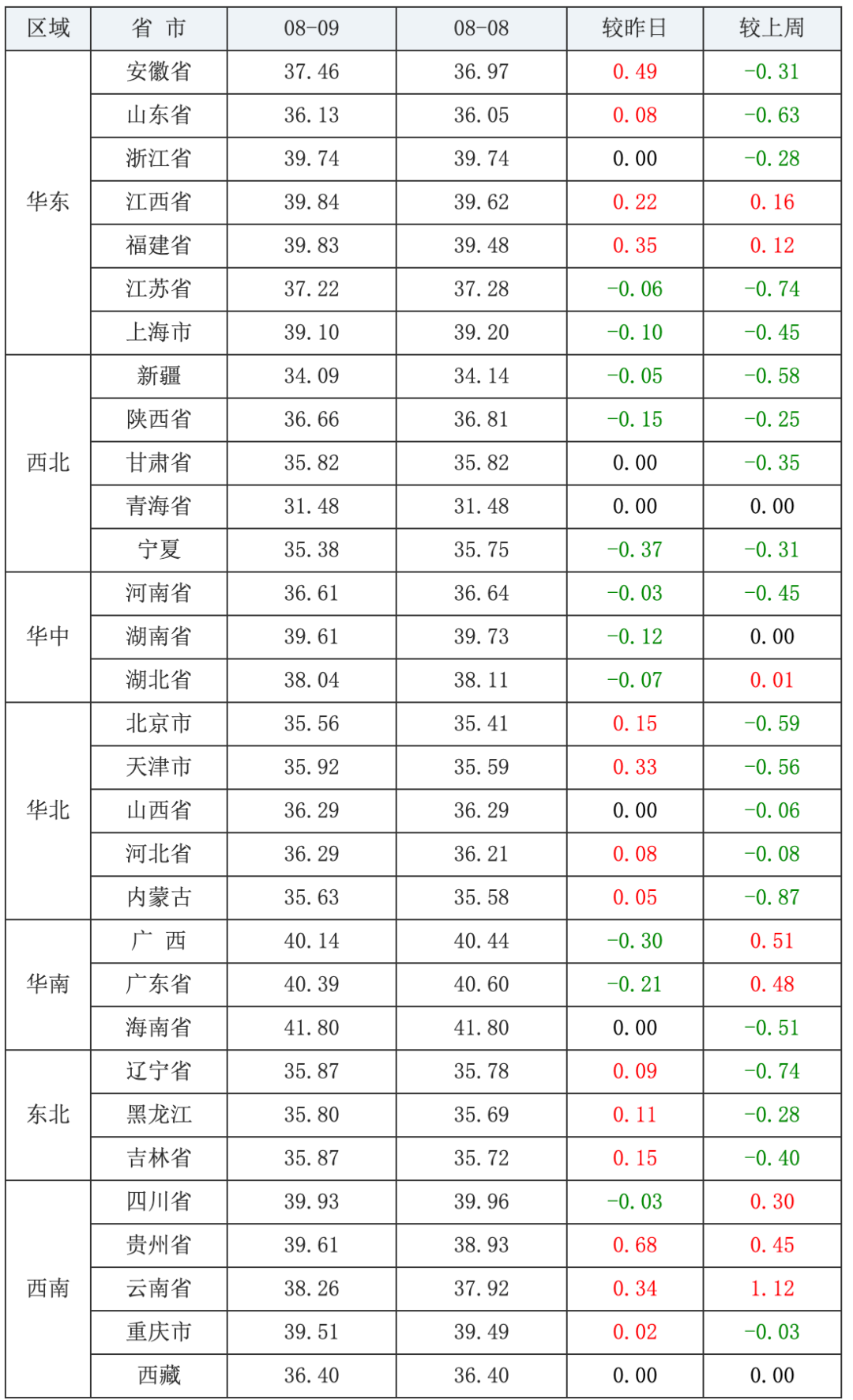 从上表可知,今日我国下跌省份有“止血”之态势,跌势较昨日明显收窄,涨势较昨日稍显强加。上涨地区主要集中在华东局部、华北大部、东北全线以及西南大部分省份。东北地区虽全线上涨,但涨幅偏弱,幅度在0.09-0.15元/公斤之间;而西南地区虽有个别省份下跌,但涨幅稍显偏强,幅度在0.02-0.68元/公斤之间。