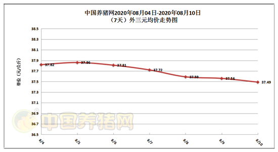 2020年08月10日(星期一),据中国养猪网猪价系统监测全国外三元均价为37.49元/公斤,猪价较昨日(37.56元/公斤)下跌了0.07元/公斤,较上月下跌了0.85元/公斤。