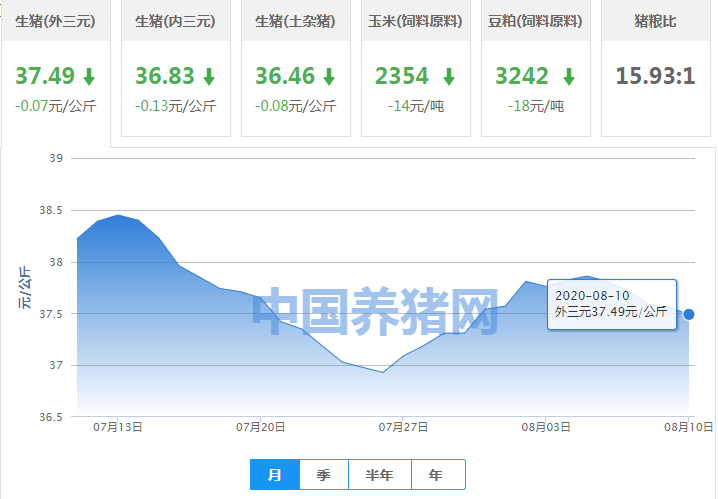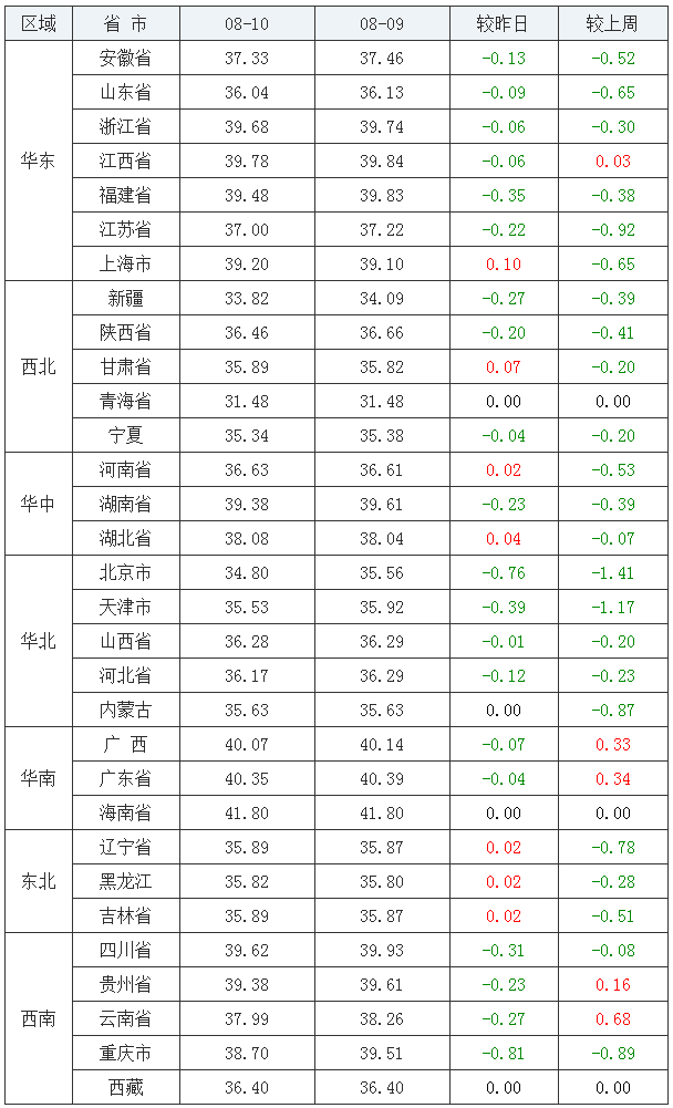 随着前些日子的猪价上涨,消费端对高价猪肉产生抵触,叠加现阶段的高温天气,消费端购买肉类频率较低,下游白条走货缓慢,屠企开工率仍处历史性低位。猪价下跌范围由北往南蔓延,且跌幅扩大。虽下跌范围扩大且跌势增强,但整体来看行情依旧处于震荡态势,行情依旧较稳。