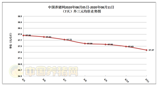 从“中国养猪网2020年08月05日-08月11日(7天)外三元均价走势图”来看,近一周来我国生猪价格连续下跌走势,目前价格为37.37元/公斤,越来越逼近“36元”猪价……
