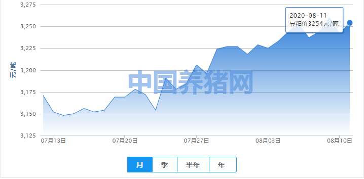 2020年08月11日(星期二),今日全国豆粕均价为3254元/吨,报价与昨日上涨12元/吨,报价与上周上涨了21元/吨,较上月上涨了83元/吨!