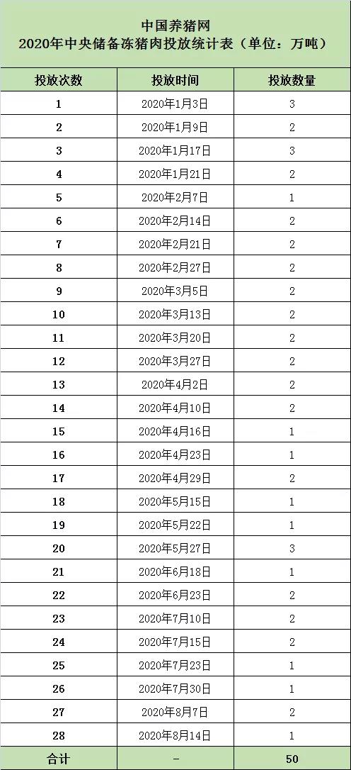2020年8月10日华储网发布通知,将于8月14日出库投放竞价交易中央储备冻猪肉1万吨。这将是年内第28次投放,累计投放量将达50万吨,这对猪价会形成微弱的利空,不过整体影响不大!