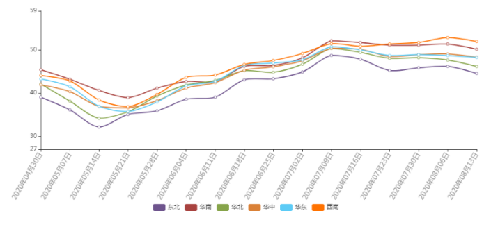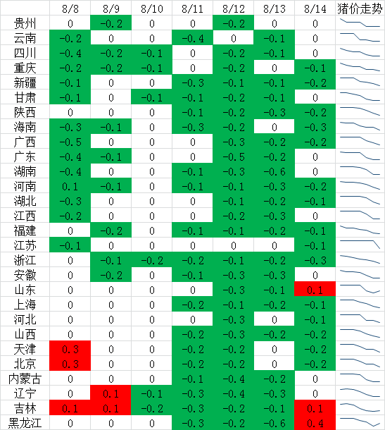 8月8—13日,猪价跌势逐步扩大,东北部分低价区濒临34元/公斤,南方高价区跌破40元/公斤。北方供应量增加,但是消费市场走货缓慢,而南方消费疲软,且受北方猪源冲击,高价猪源成交困难,高价猪价回落。8月14日,跌势放缓,东北局部及山东出现反弹现象。主要是受降雨影响,养殖户有抗价情绪,屠宰企业收猪有难度,提高生猪收购价格。