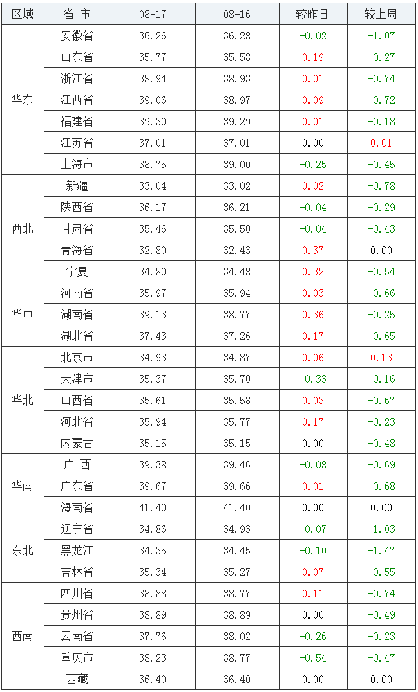 华东地区上涨范围在0.01-0.19元/公斤;西北地区上涨范围在0.02-0.37元/公斤;华中地区上涨范围在0.03-0.36元/公斤;华北地区上涨范围在0.03-0.17元/公斤;华南、东北、西南地区下跌现象较为明显,下跌范围在0.08-0.54元/公斤。