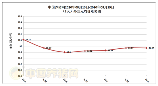 2020年08月19日(星期三),据中国养猪网猪价系统监测全国外三元均价为36.97元/公斤,猪价与昨日(36.97元/公斤)持平,较上月下跌了0.74元/公斤。