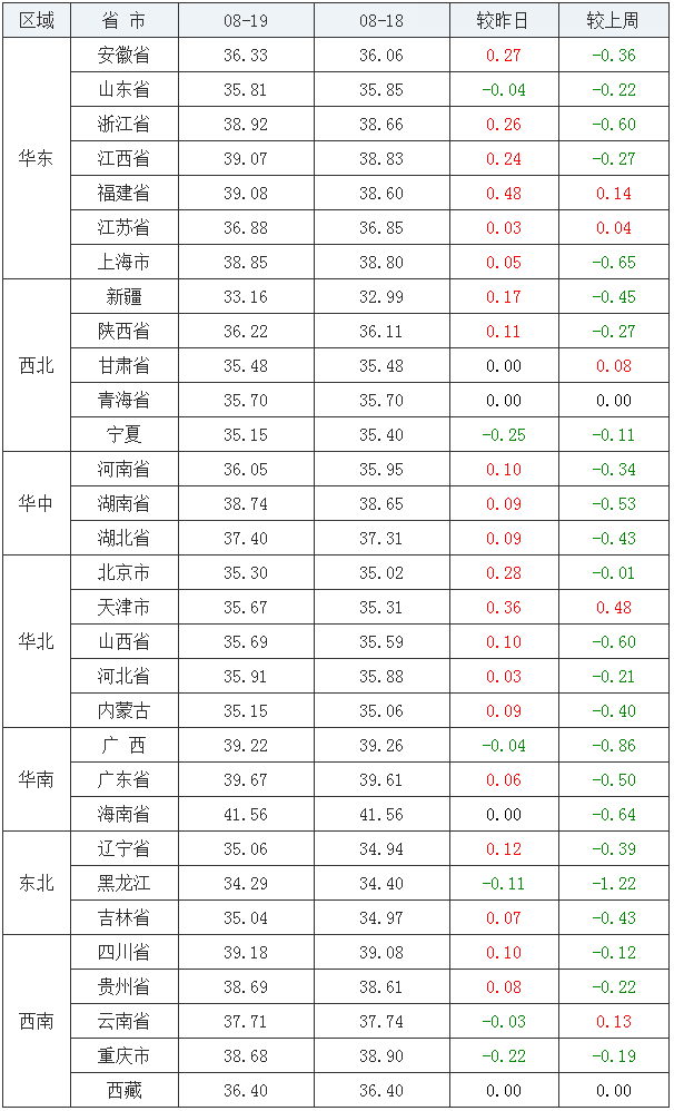 今日各地猪价有回暖迹象,多省飘红。上涨地区主要集中在华东、华中、华北、东北地区;其中华东、华中、华北、东北地区几乎呈全线上涨姿态,涨幅在0.03-0.48元/公斤区间。可谓有人欢喜有人悲,在大部分地区呈上涨趋势的之时,也有小部分地区呈下跌态势,这就包括西南、西北地区,两个“西部地区”似乎是本次上涨的难兄难弟,但虽然上涨之势没有眷顾“它们”,好在下跌态势没有对其造成太大“伤害”,整体行情企稳仅有部分地区小幅涨跌。