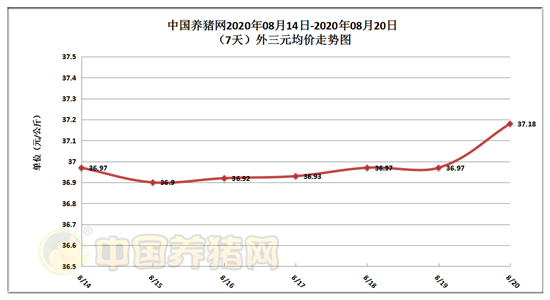 2020年08月20日(星期四),据中国养猪网猪价系统监测全国外三元均价为37.18元/公斤,猪价与昨日(36.97元/公斤)持平,较上月下跌了0.47元/公斤。
