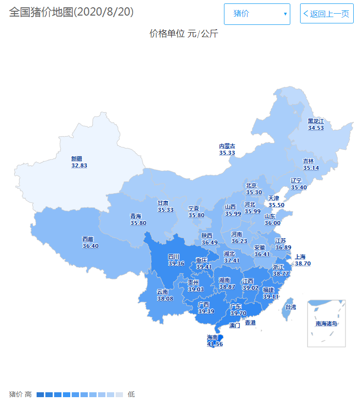 内三元排行前五地区:海南省41.52元/公斤、贵州省40.68元/公斤、广东省38.73元/公斤、四川省38.72元/公斤、湖南省38.65元/公斤