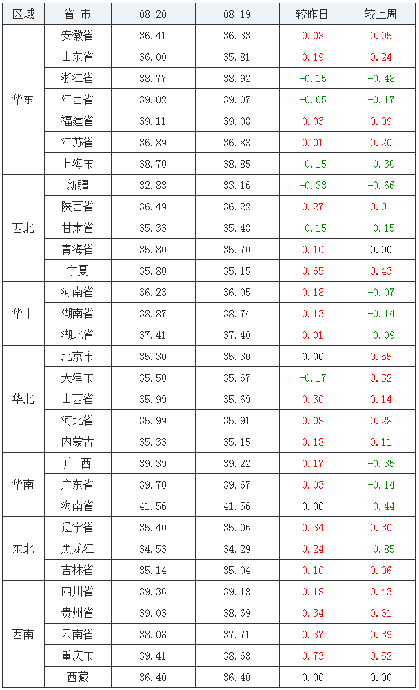今日猪价飘红现象仍旧存在,且上涨地区较昨日有所增加,储备肉的投放消息似乎并未对猪价造成打击,且涨势较昨日也有一定提升。上上涨地区主要集中在西南、东北、华南、华北、华中、西北局部地区,仅有华东地区出现局部下跌情况,但基本呈小跌态势,对大局影响甚微。供应端部分规模场生猪出栏有增多迹象,局地因降雨等恶劣天气出现中等体重生猪集中出栏现象,故此猪价继续上涨或难以维持。