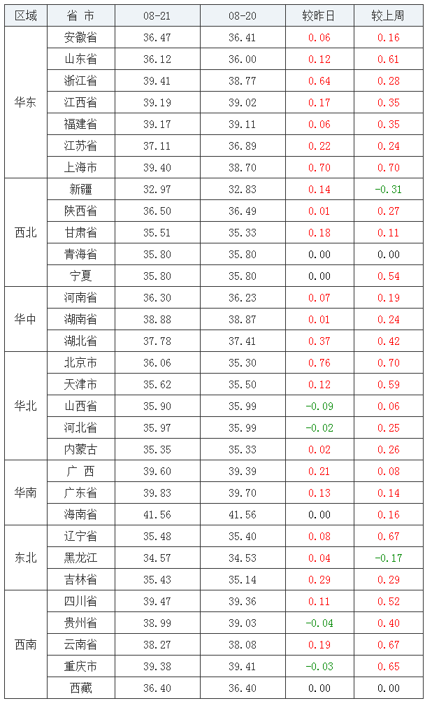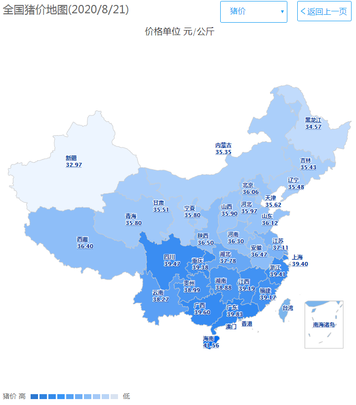 内三元排行前五地区:海南省41.52元/公斤、贵州省40.32元/公斤、广东省39.28元/公斤、江西省39.18元/公斤、四川省38.99元/公斤