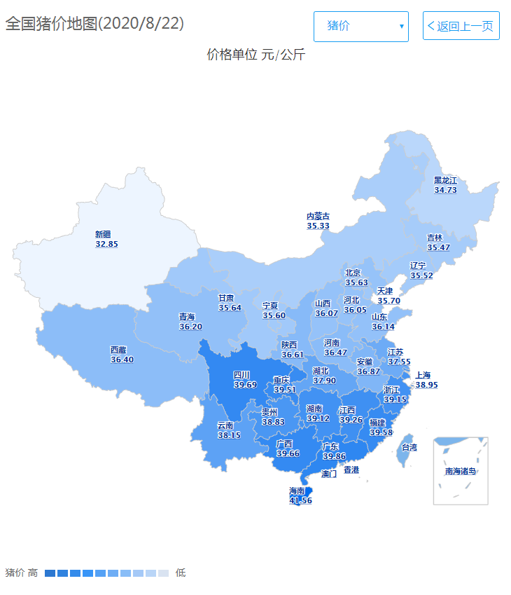 今日猪价最高地区为:江苏省,外三元均价区间在36.40-37.80元/公斤,涨幅为0.44元/公斤。