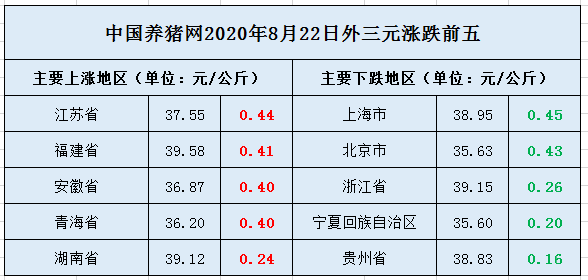 安徽省:生猪(外三元)均价36.87元/公斤,较昨日上涨0.40元/公斤;