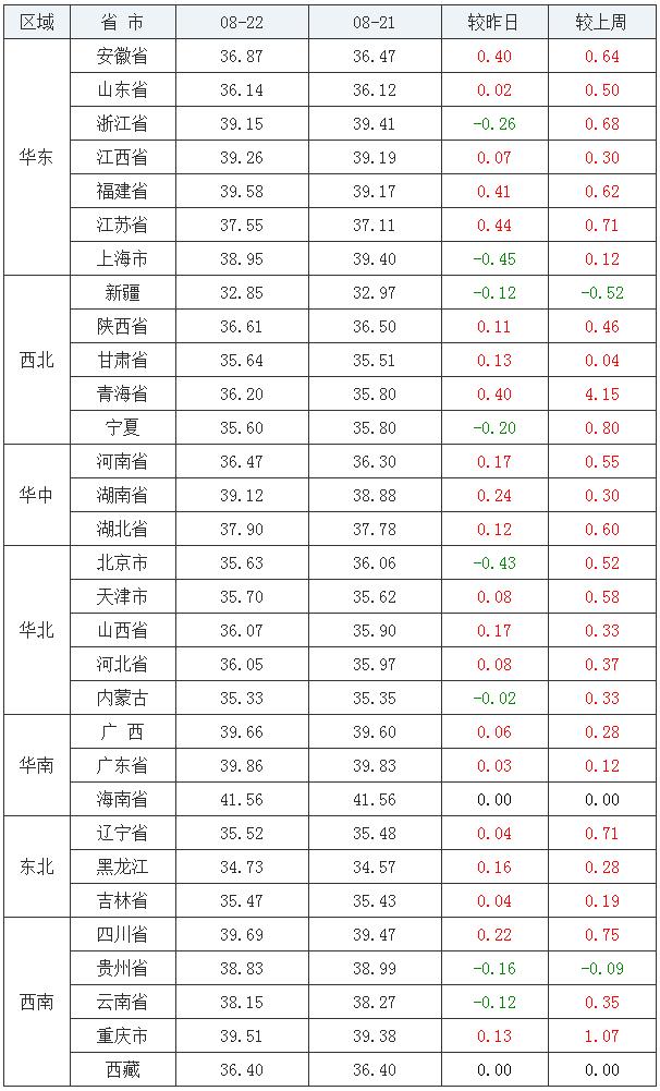 目前华东地区涨幅范围在0.02-0.44元/公斤之间;
