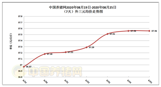 从“中国养猪网2020年08月19日-08月25日(7天)外三元均价走势图”来看,从近期猪价走势来看,今日我国猪价似乎开始扭涨为跌,目前猪价高点停止在37.56元/公斤,后市还能超越吗?