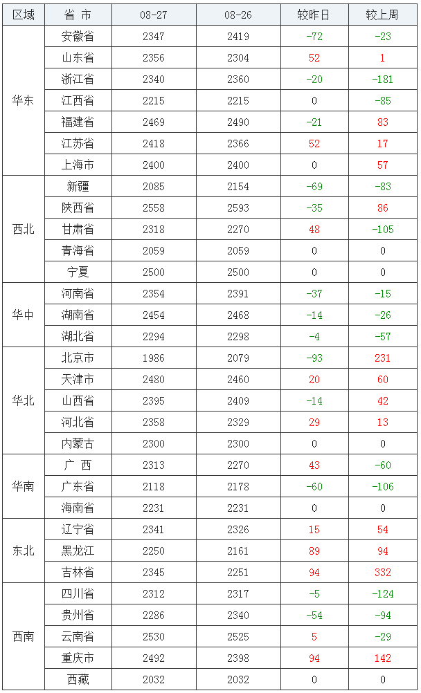 玉米均价(饲料原料)后十:北京市1986元/吨、西藏自治区2032元/吨、青海省2059元/吨、新疆维吾尔自治区2085元/吨、广东省2118元/吨、江西省2215元/吨、海南省2231元/吨、黑龙江省2250元/吨、贵州省2286元/吨、湖北省2294元/吨。