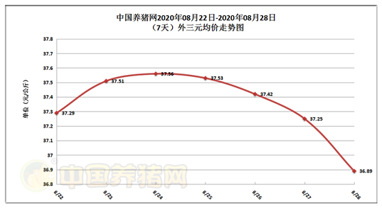 2020年08月28日(星期五),据中国养猪网猪价系统监测全国外三元均价为36.89元/公斤,猪价与昨日(37.25元/公斤)下跌了0.36元/公斤,较上月下跌了0.30元/公斤。