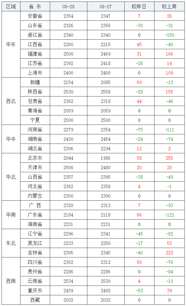 全国玉米涨跌表(2020/08/28)