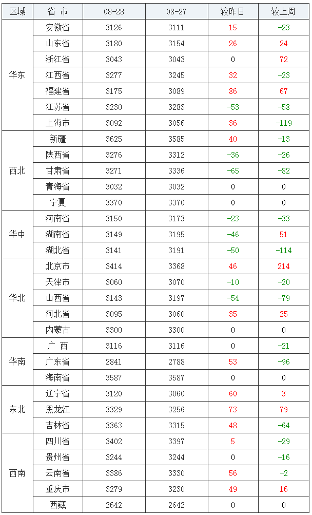 豆粕均价(饲料原料)前十:新疆维吾尔自治区3625元/吨、海南省3587元/吨、北京市3414元/吨、四川省3402元/吨、云南省3386元/吨、宁夏回族自治区3370元/吨、吉林省3363元/吨、黑龙江省3329元/吨、内蒙古自治区3300元/吨、重庆市3279元/吨、