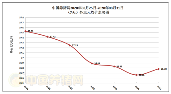 2020年08月31日(星期一),据中国养猪网猪价系统监测全国外三元均价为36.78元/公斤,猪价与昨日(37.66元/公斤)上涨了0.12元/公斤,较上月下跌了0.76元/公斤。