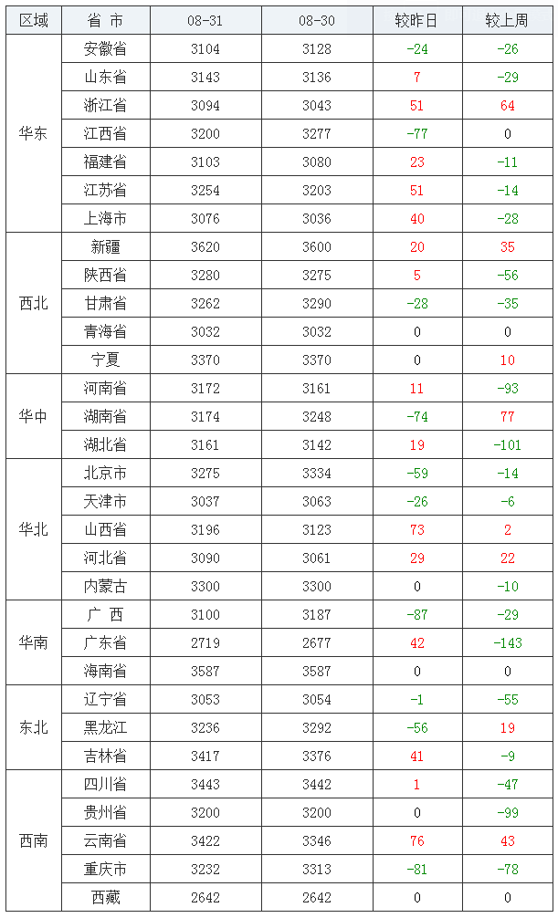 全国豆粕涨跌表(2020/08/31)