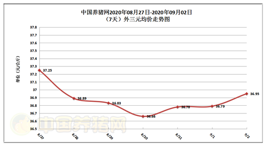 2020年09月02日(星期三),据中国养猪网猪价系统监测全国外三元均价为36.95元/公斤,猪价与昨日(37.79元/公斤)上涨了0.16元/公斤,较上月下跌了0.86元/公斤。