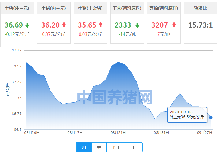 内蒙古自治区:生猪(外三元)均价34.80元/公斤,较昨日持平;生猪(内三元)均价34.00元/公斤;生猪(土杂猪)均价33.00元/公斤。